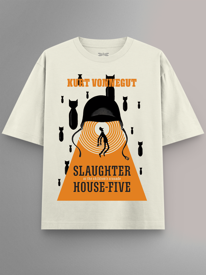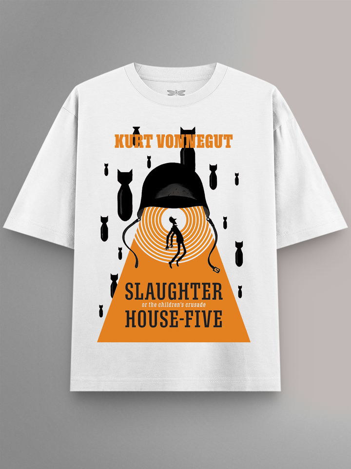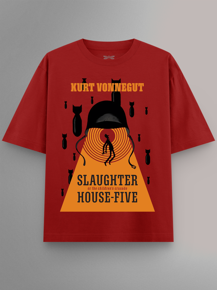 Product features a silhouetted figure trapped in concentric red rings beneath a looming soldier’s helmet — its chinstraps hanging like puppet strings. Black bombs fall against a stark red backdrop, freezing the chaos of war in a surreal, theatrical frame. Referencing Kurt Vonnegut’s dark anti-war satire, the design channels the fatalism and absurdity of a world where time fractures and trauma loops forever. Part of the Counterculture Books Collection.