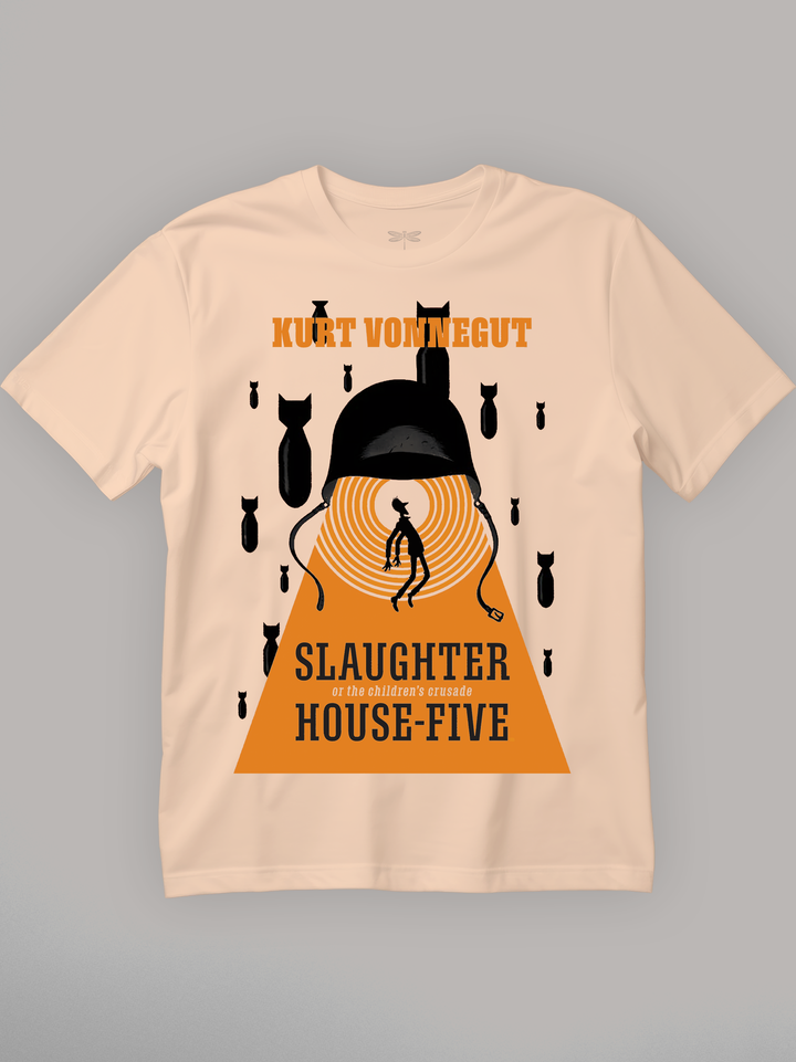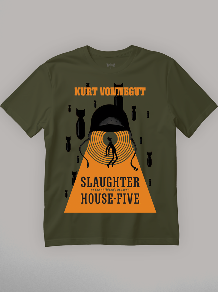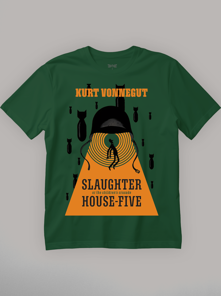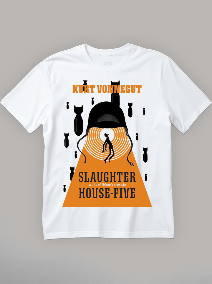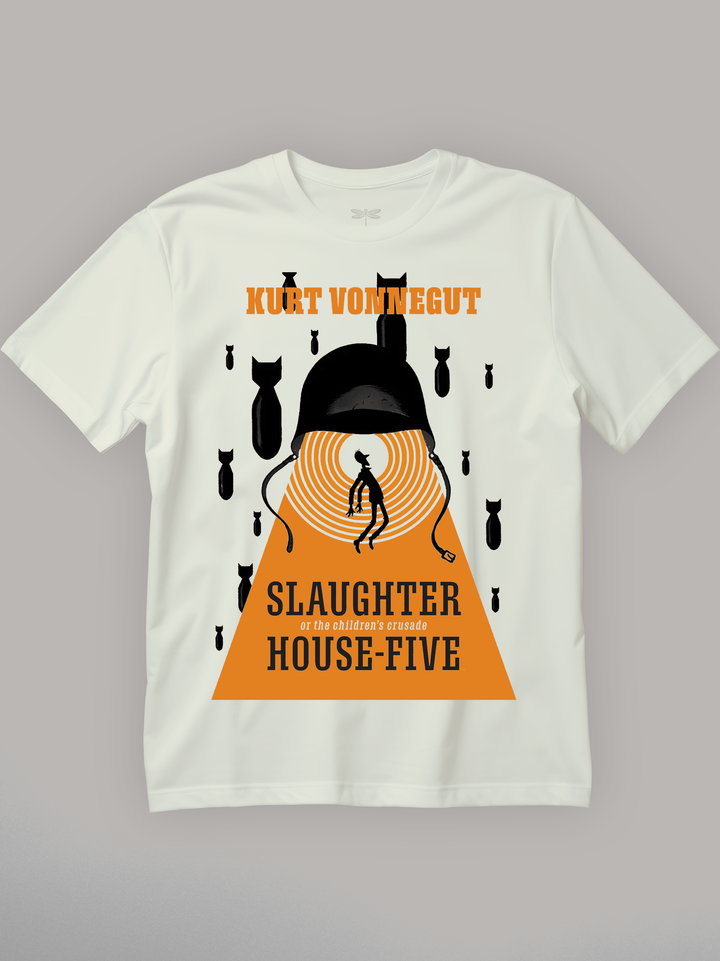 Product features a silhouetted figure trapped in concentric red rings beneath a looming soldier’s helmet — its chinstraps hanging like puppet strings. Black bombs fall against a stark red backdrop, freezing the chaos of war in a surreal, theatrical frame. Referencing Kurt Vonnegut’s dark anti-war satire, the design channels the fatalism and absurdity of a world where time fractures and trauma loops forever. Part of the Counterculture Books Collection.