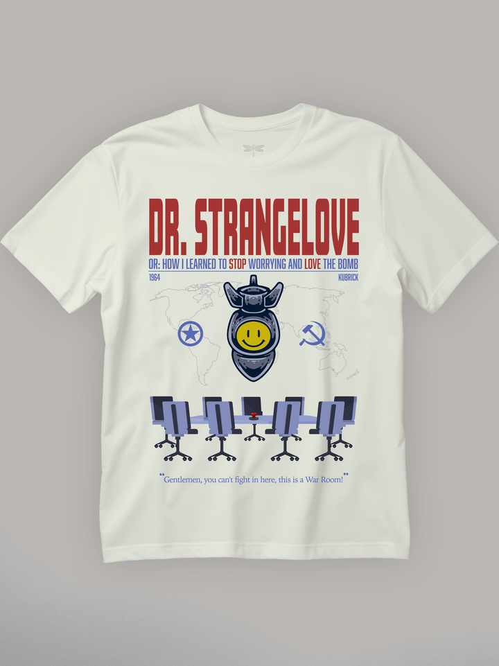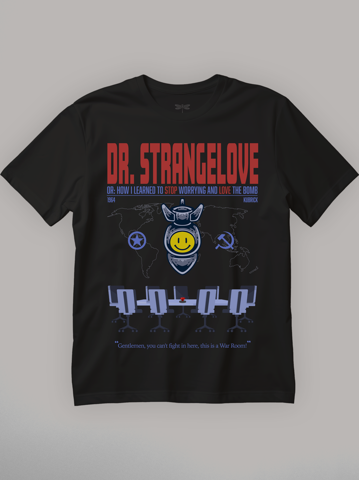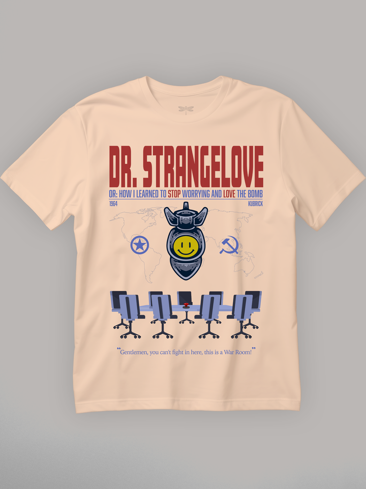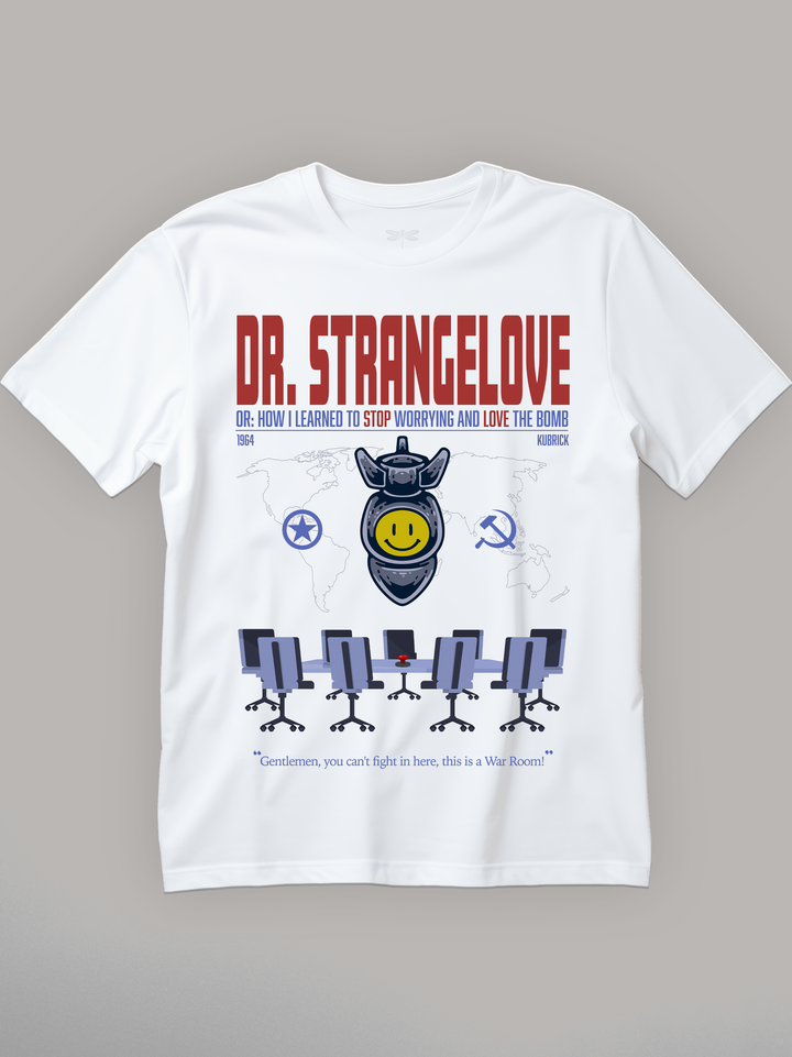 Product features a graphic inspired by Kubrick's Dr. Strangelove or: How I Learned to Stop Worrying and Love the Bomb, depicting the iconic War Room table under the shadow of a descending bomb — reimagined with a satirical smile. Framed by Cold War insignias and the famous quote, “Gentlemen, you can’t fight in here, this is a War Room!”, the design captures the film’s absurd take on power and paranoia with clean, retro line art and bold contrasts. Part of the Cult Movies collection.