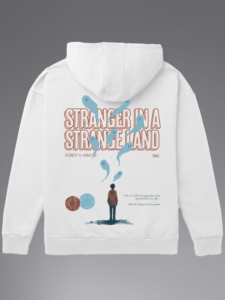 Product features a lone figure in a red jacket standing beneath a cluster of floating, ghost-like forms — soft blue and expressionless, suspended midair. The title looms in layered typography, suggesting both physical distance and spiritual dissonance. Referencing Robert A. Heinlein’s cult sci-fi novel, the design captures the alienation of being human in a world that doesn’t quite make sense. Paired with a sharply ironic quote on wisdom and indifference. Part of the Counterculture Books Collection.