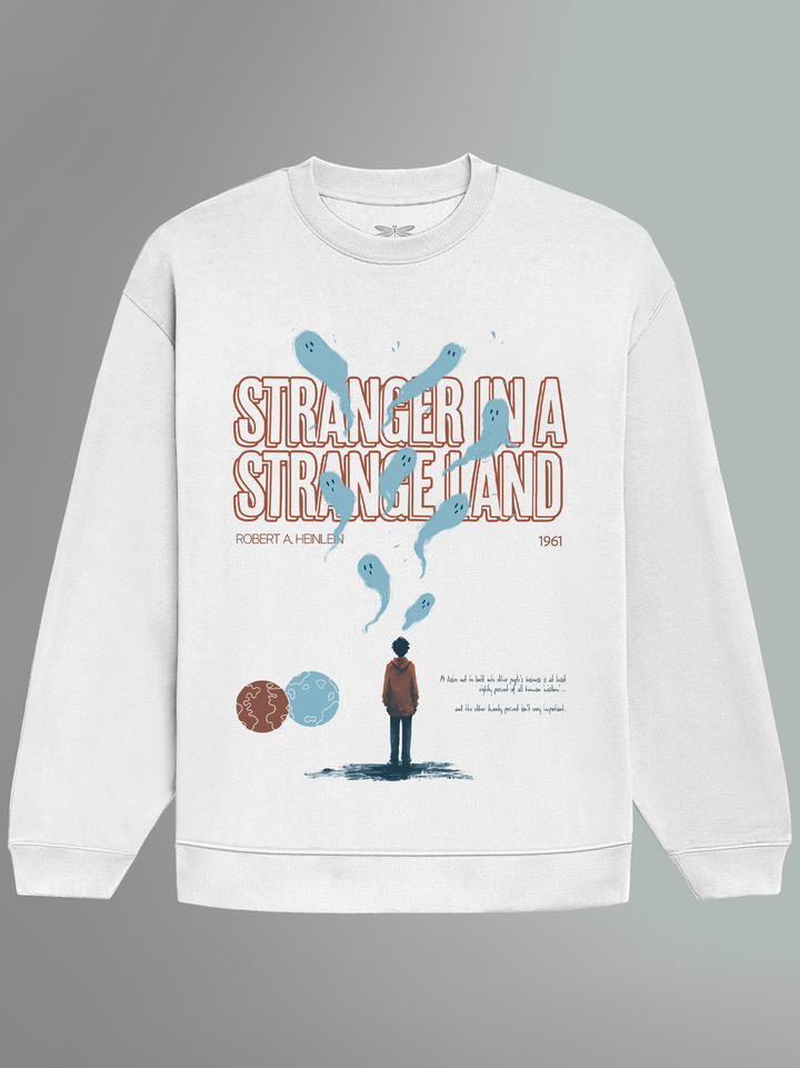 Product features a lone figure in a red jacket standing beneath a cluster of floating, ghost-like forms — soft blue and expressionless, suspended midair. The title looms in layered typography, suggesting both physical distance and spiritual dissonance. Referencing Robert A. Heinlein’s cult sci-fi novel, the design captures the alienation of being human in a world that doesn’t quite make sense. Paired with a sharply ironic quote on wisdom and indifference. Part of the Counterculture Books Collection.