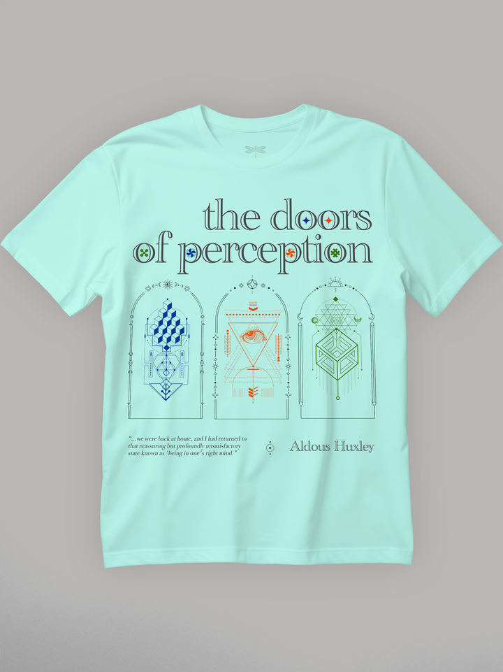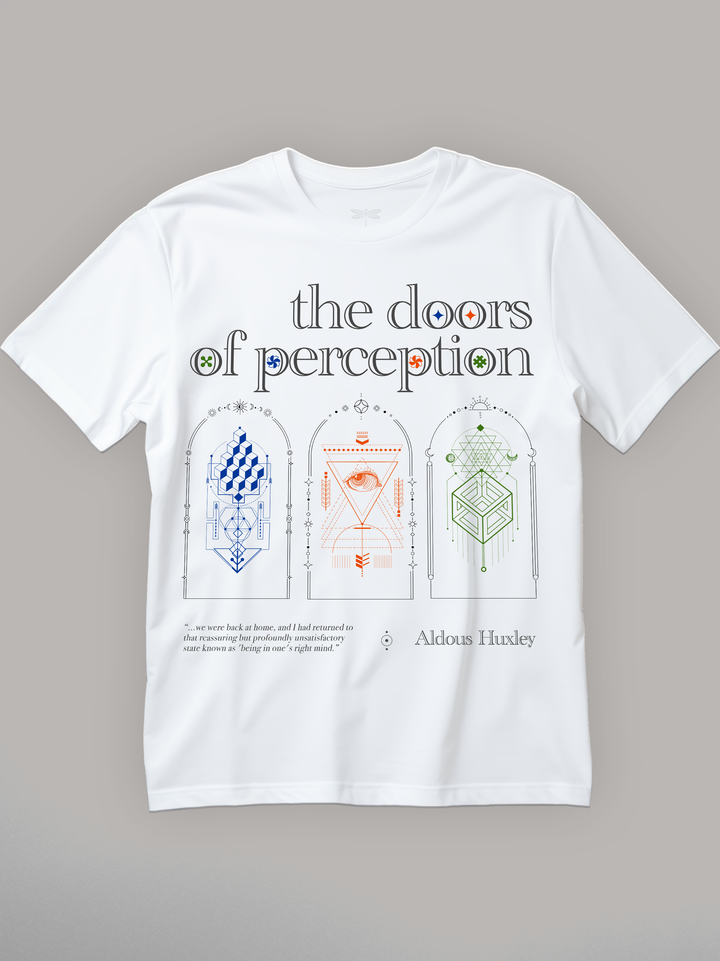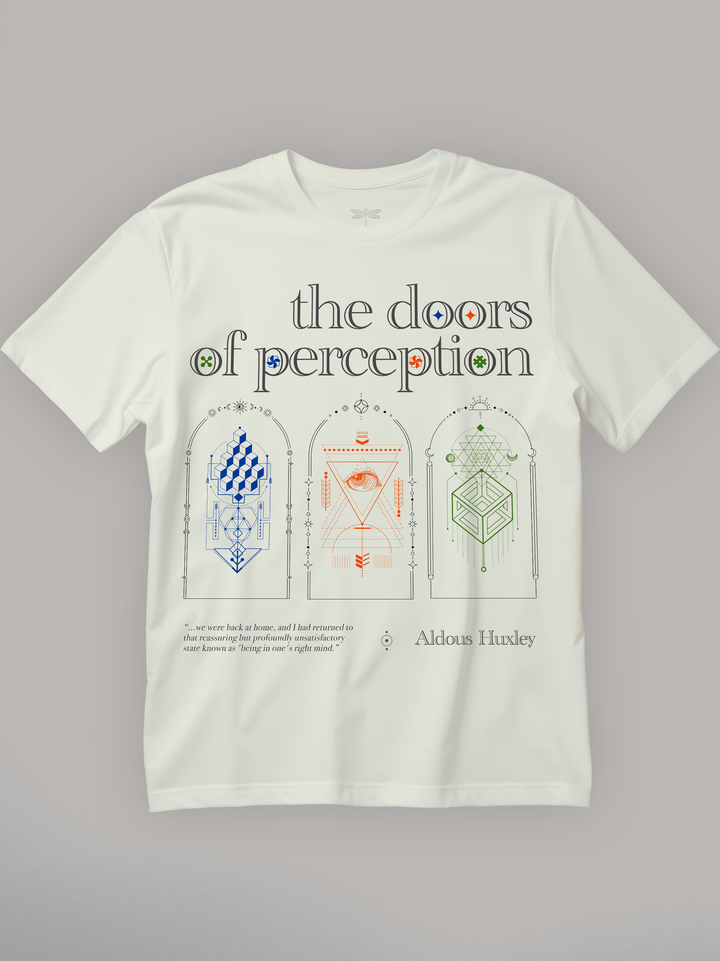 Product features three ornate doorways, each etched in geometric symbolism and radiant color, with a central all-seeing eye gazing outward. Drawing inspiration from Aldous Huxley’s psychedelic book, the design explores altered consciousness, perception, and the blurred boundary between inner truth and illusion. Finished with a quote that captures the quiet dread of returning to normalcy. Part of the Counterculture Books Collection.