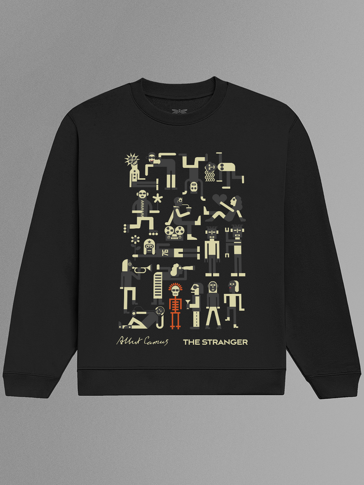 Product features a chaotic grid of abstract figures — blank-faced, disconnected, mechanical — rendered in a brutalist, pixel-style arrangement. Drawing from Albert Camus' The Stranger, the design echoes Meursault’s emotional detachment, the randomness of violence, and the absurd theatre of human existence. A cold, clever tribute to alienation in the modern world.Part of the Counterculture Books Collection.