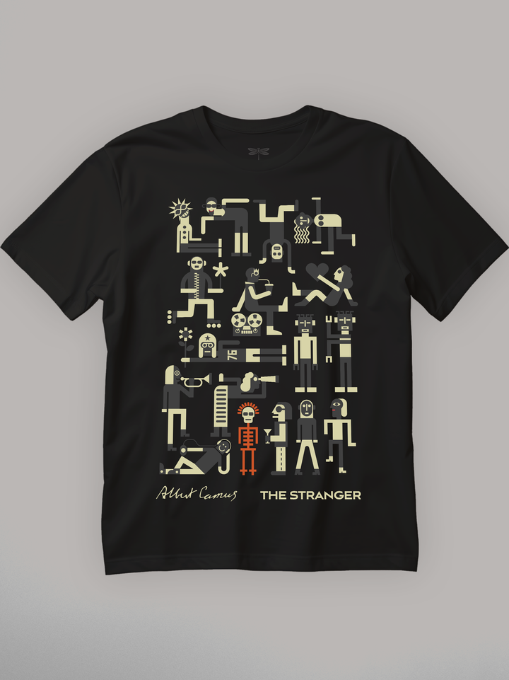 Product features a chaotic grid of abstract figures — blank-faced, disconnected, mechanical — rendered in a brutalist, pixel-style arrangement. Drawing from Albert Camus' The Stranger, the design echoes Meursault’s emotional detachment, the randomness of violence, and the absurd theatre of human existence. A cold, clever tribute to alienation in the modern world.Part of the Counterculture Books Collection.