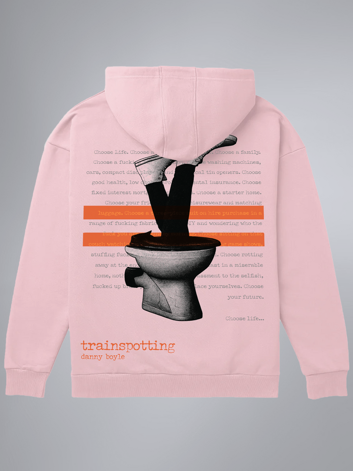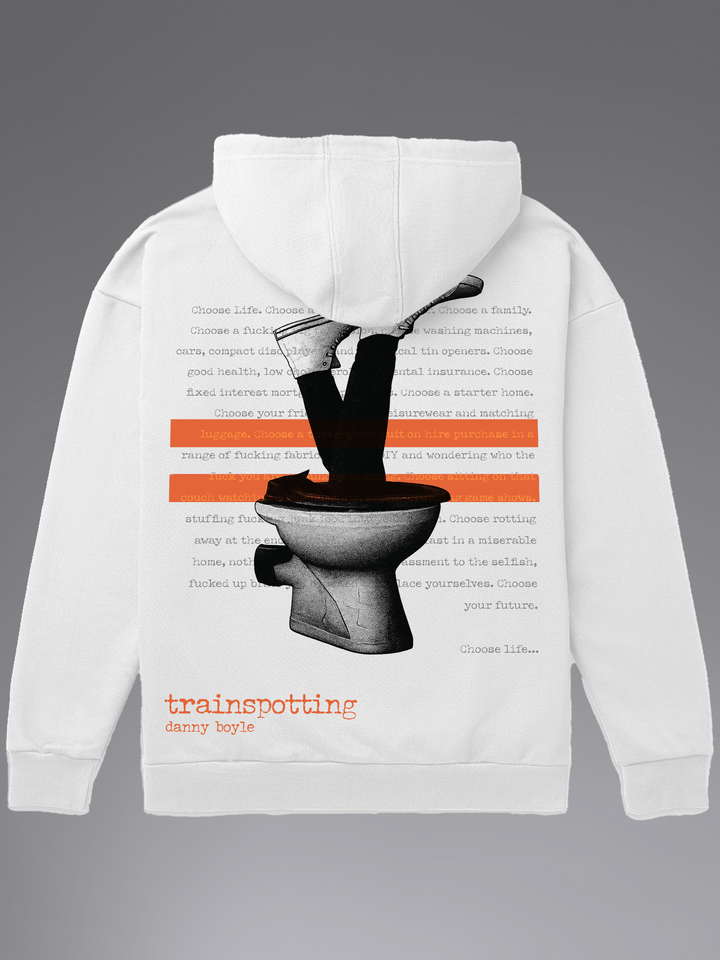 Product features the iconic “Choose Life” monologue blacked out with orange censorship bars, with a pair of legs diving headfirst into a toilet — a twisted nod to the film’s most infamous scene. A visual tribute to Trainspotting’s raw portrayal of addiction, disillusionment, and anti-consumerist rebellion. Part of the Cult Movies Collection.