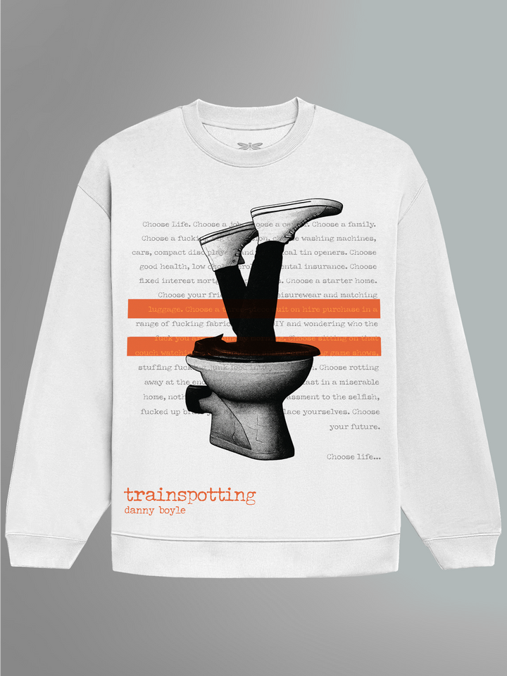 Product features the iconic “Choose Life” monologue blacked out with orange censorship bars, with a pair of legs diving headfirst into a toilet — a twisted nod to the film’s most infamous scene. A visual tribute to Trainspotting’s raw portrayal of addiction, disillusionment, and anti-consumerist rebellion. Part of the Cult Movies Collection.