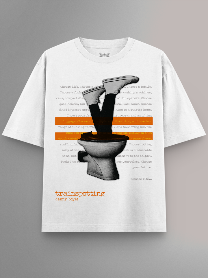 Product features the iconic “Choose Life” monologue blacked out with orange censorship bars, with a pair of legs diving headfirst into a toilet — a twisted nod to the film’s most infamous scene. A visual tribute to Trainspotting’s raw portrayal of addiction, disillusionment, and anti-consumerist rebellion. Part of the Cult Movies Collection.