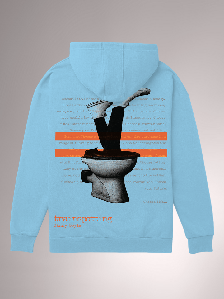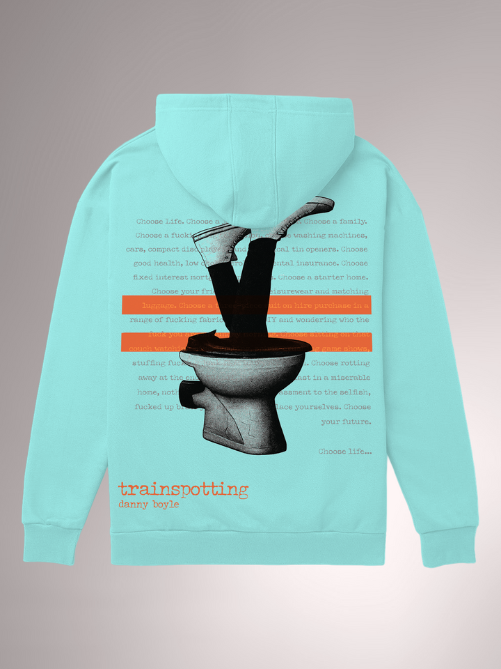 Product features the iconic “Choose Life” monologue blacked out with orange censorship bars, with a pair of legs diving headfirst into a toilet — a twisted nod to the film’s most infamous scene. A visual tribute to Trainspotting’s raw portrayal of addiction, disillusionment, and anti-consumerist rebellion. Part of the Cult Movies Collection.