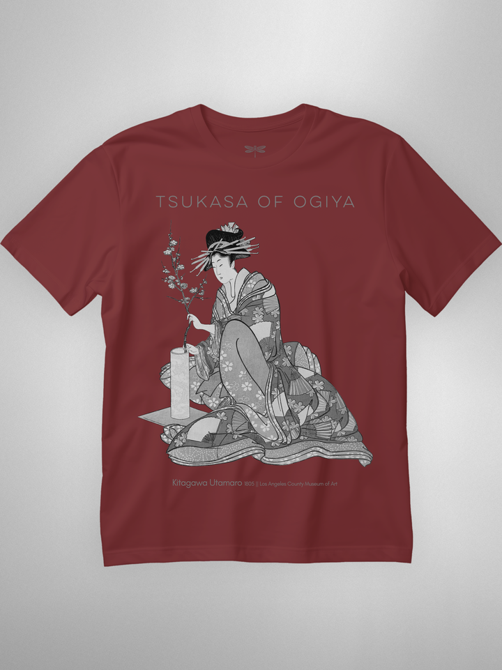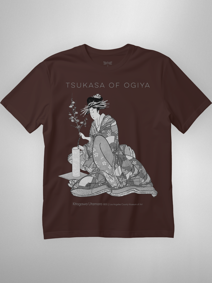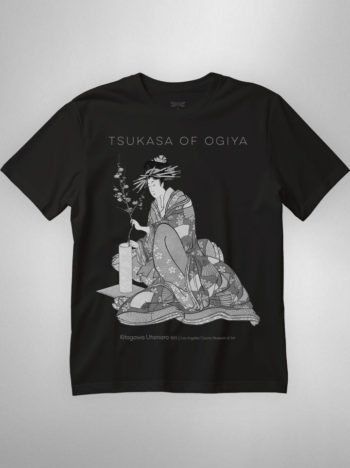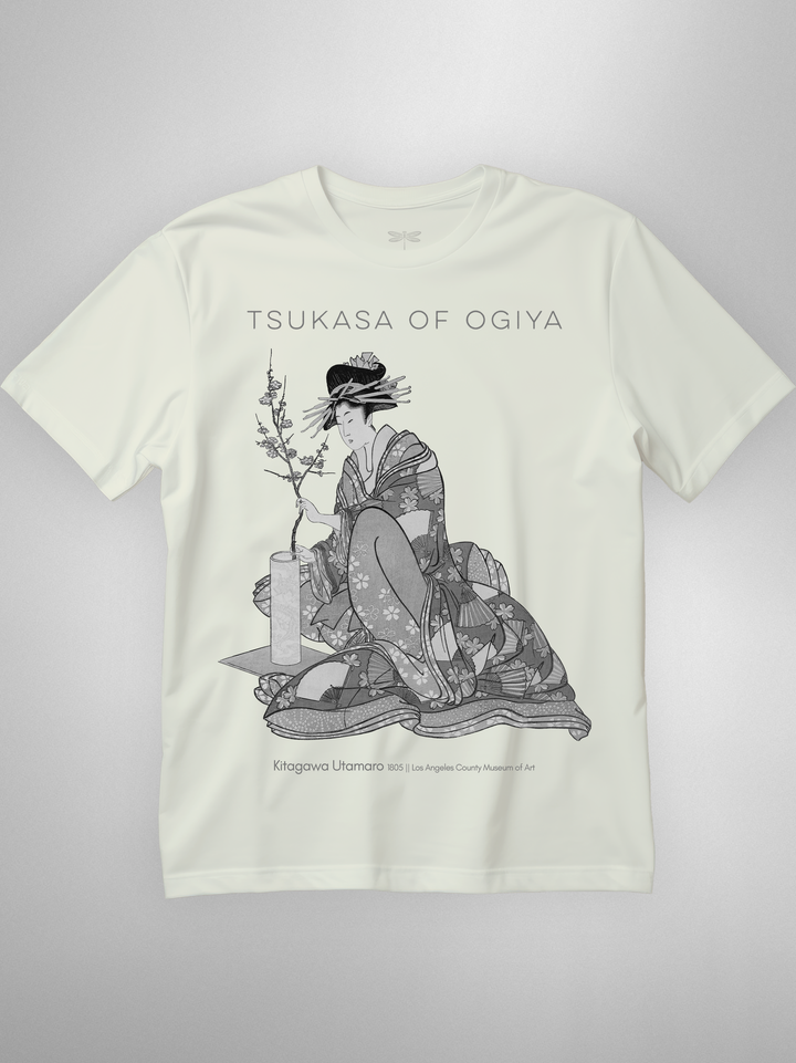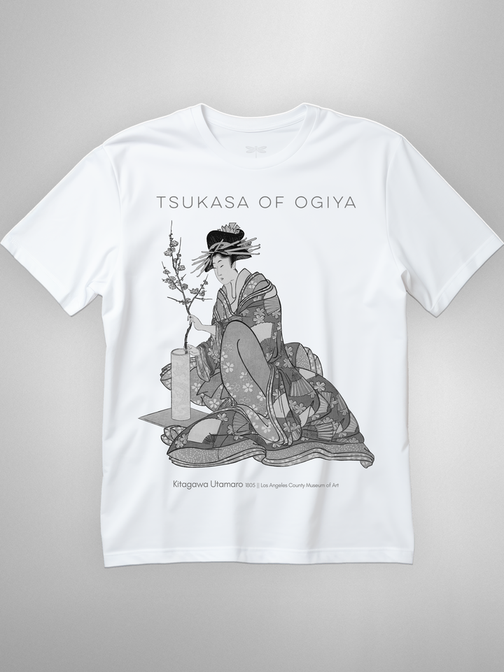Product features Tsukasa of the Ogiya (扇屋司) by Kitagawa Utamaro, c. 1805. The print portrays a courtesan seated gracefully, arranging a branch of blossoms, her robes patterned with delicate fans and flowers. The refined linework and poised composition embody the Ukiyo-e tradition — elevating fleeting moments of beauty into timeless expressions of elegance and allure.