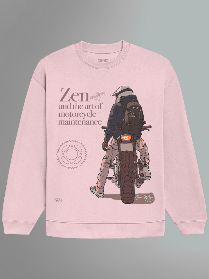 Product features a lone rider viewed from behind, walking his motorcycle forward in quiet contemplation — illustrated in warm, muted tones with crisp ink lines. Referencing Zen and the Art of Motorcycle Maintenance, the design includes subtle nods like a wrench icon, sprocket gear, and the original 1974 print date. A visual meditation on solitude, philosophy, and the pursuit of quality. Part of the Counterculture Books Collection.