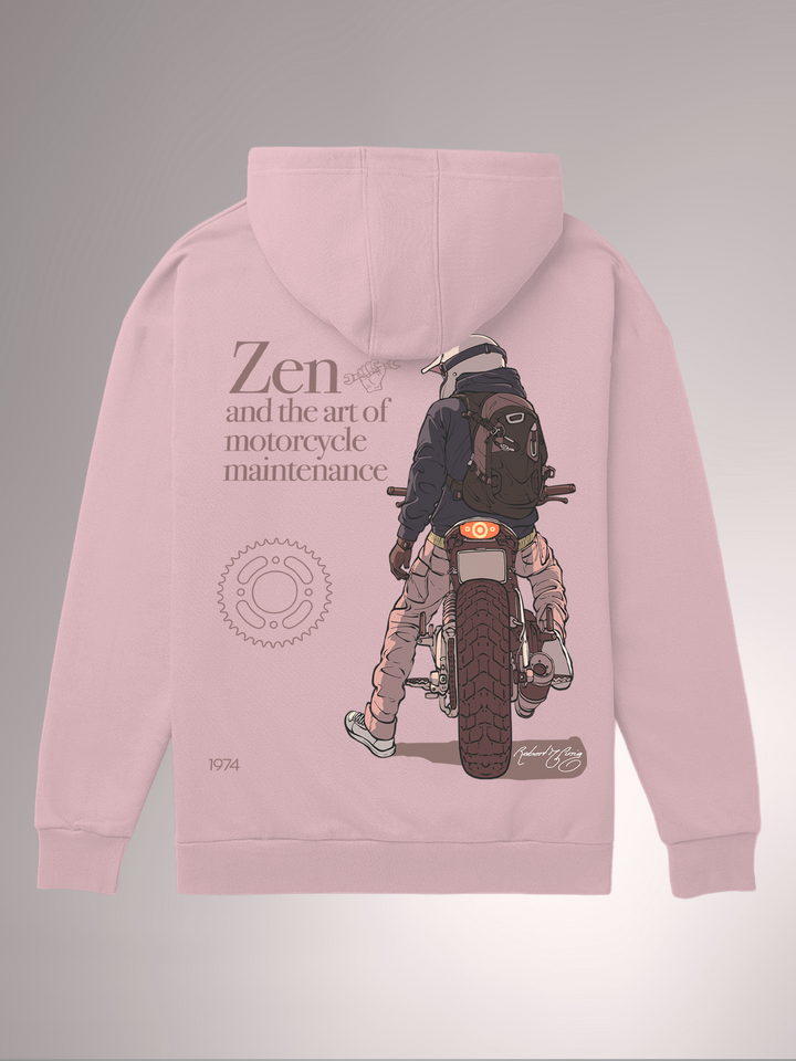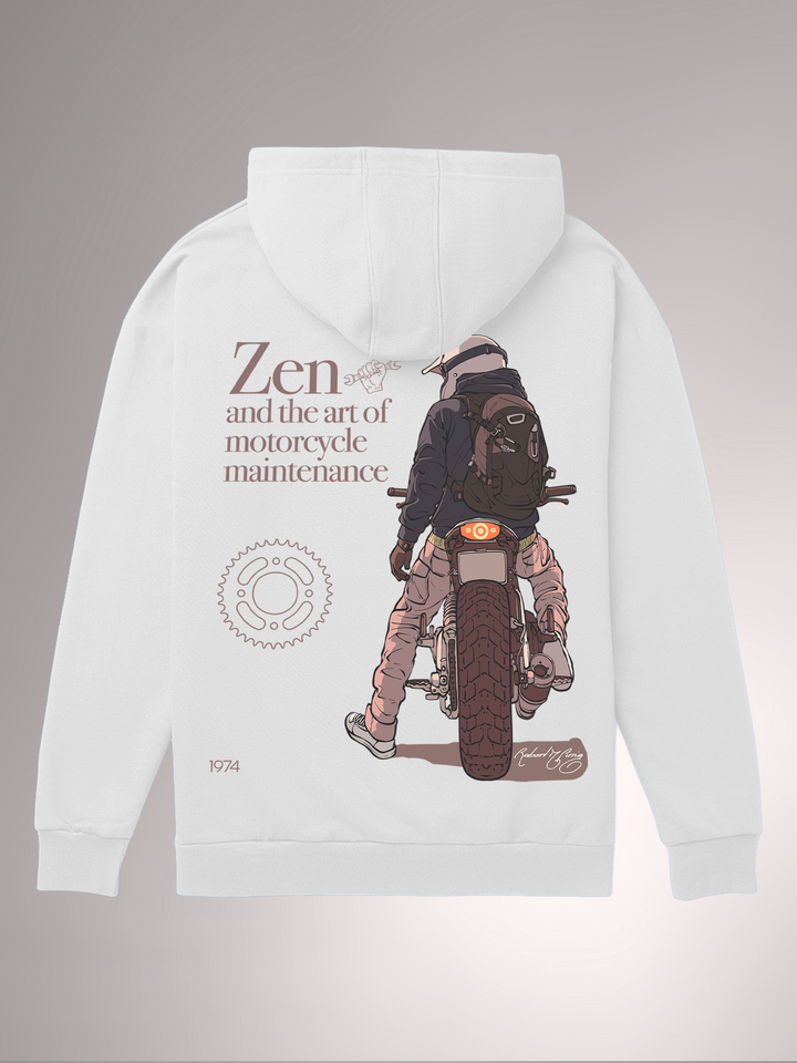 Product features a lone rider viewed from behind, walking his motorcycle forward in quiet contemplation — illustrated in warm, muted tones with crisp ink lines. Referencing Zen and the Art of Motorcycle Maintenance, the design includes subtle nods like a wrench icon, sprocket gear, and the original 1974 print date. A visual meditation on solitude, philosophy, and the pursuit of quality. Part of the Counterculture Books Collection.